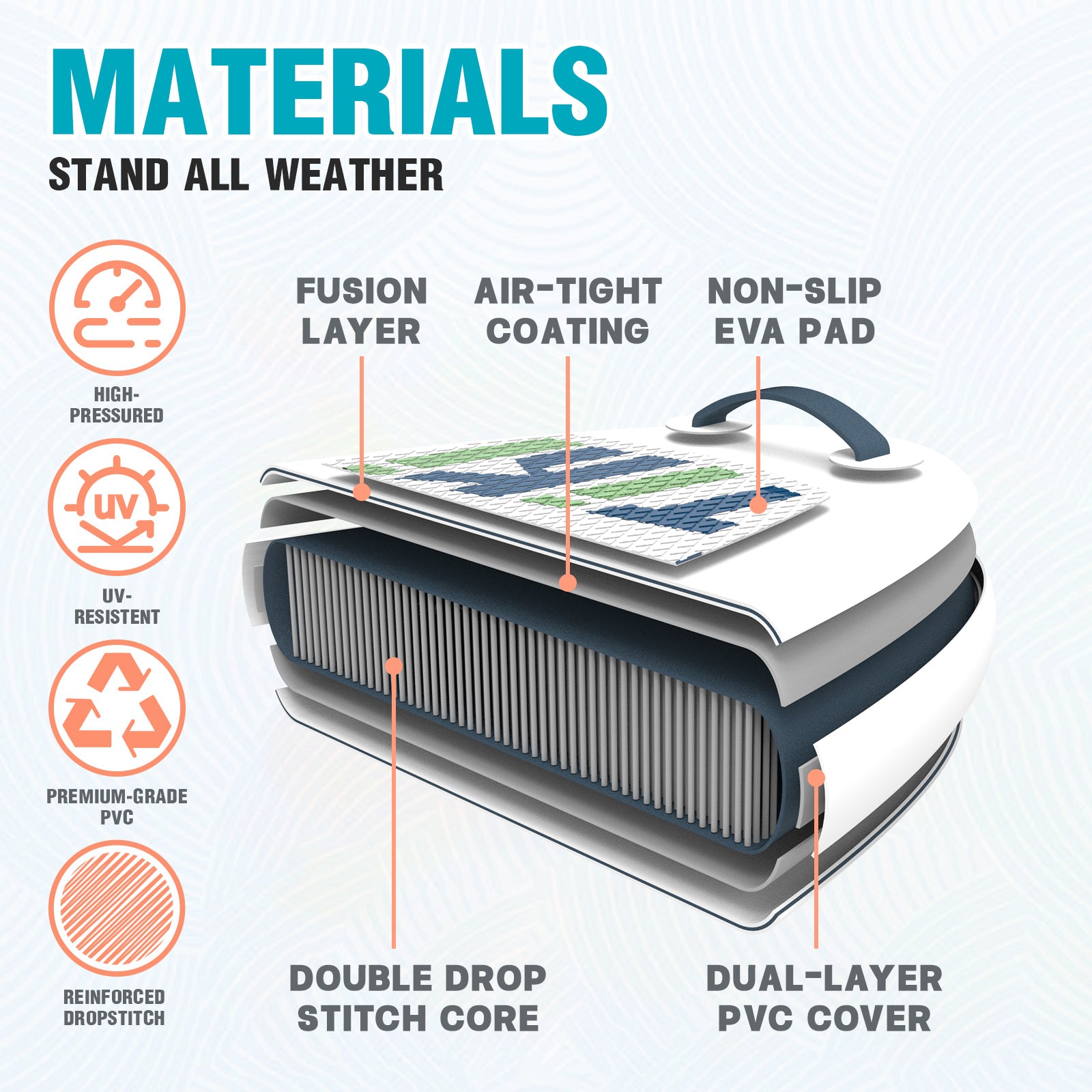 Uporaba visokokakovostnega premium-grade PVC materiala, napredna dropstitch tehnologija jedra, dvoslojni plašč z varjenimi plastmi in UV-zaščita zunanjega sloja podaljšujejo življenjsko dobo ter omogočajo vzdržljivost in trpežnost.